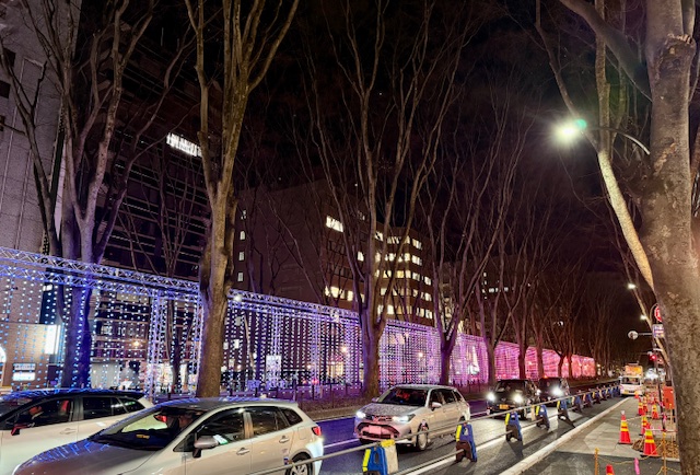 夜空の木々に暖色灯って感じの。