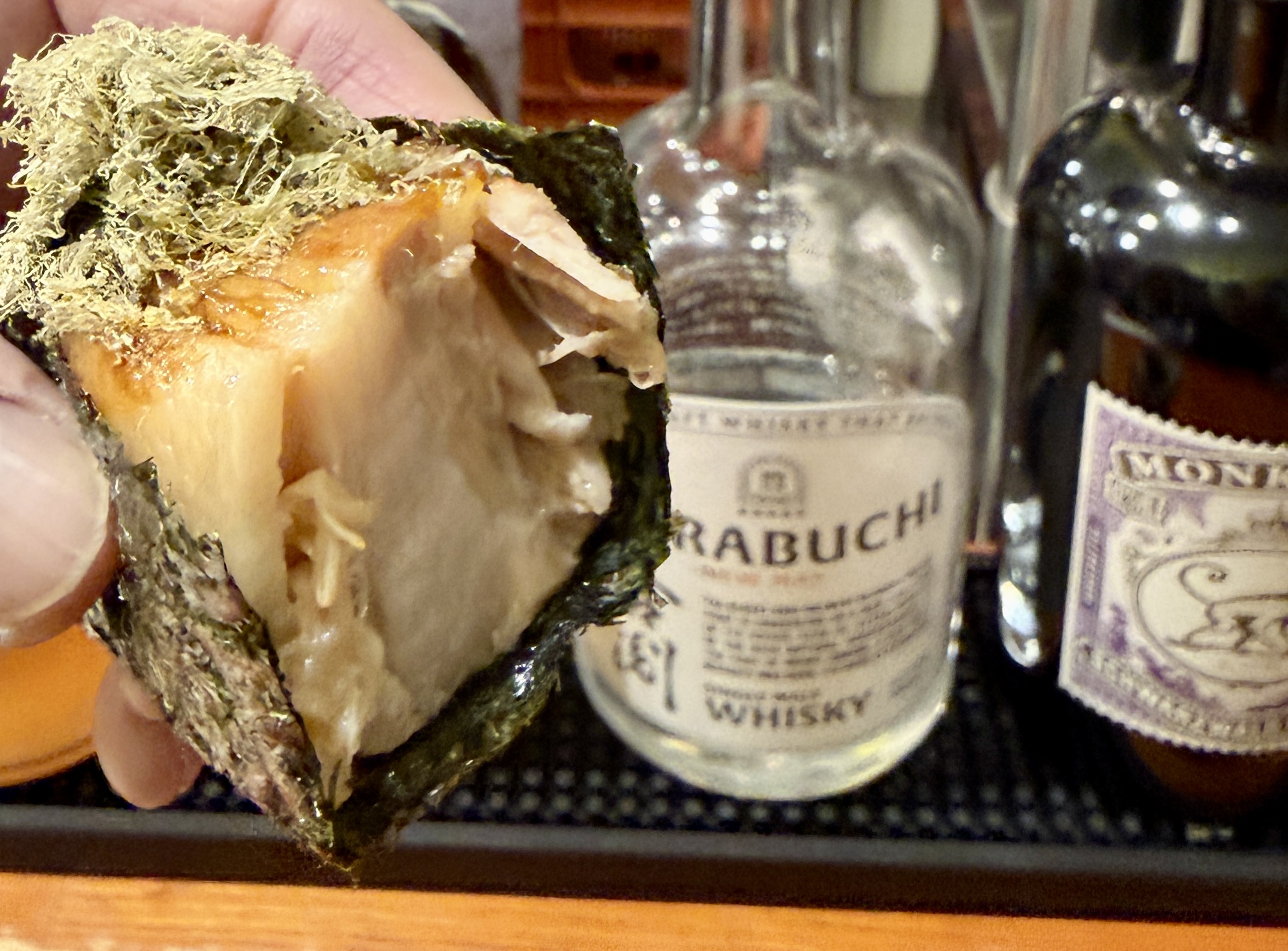 海苔で巻いて手づかみでパクリ。